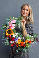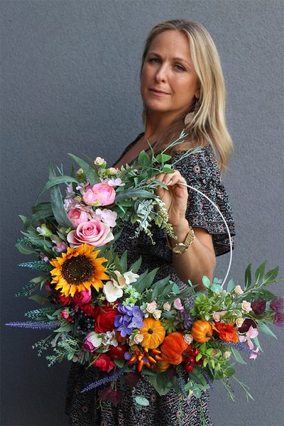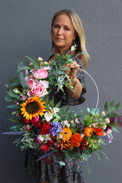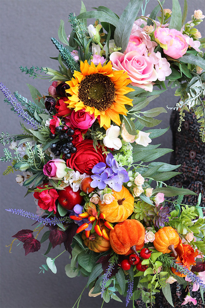 Uroczy wianek w bajecznych kolorach ogrodowych kwiatów odchodzącego lata; słonecznika, róż i hortensji. Wianek o delikatnej, subtelnej formie, skomponowany na cienkiej, metalowej białej obręczy. Kwiaty tworzą piękny bukiet kolorystyczny, przeplatają sie  w nim sinozielone liście, korale krzewów, wrzosy i owoce dyń.