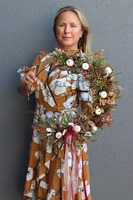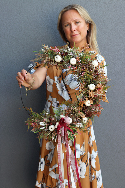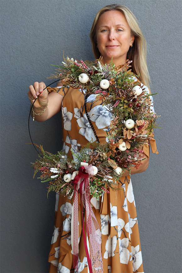 Wianek jest barwną dekoracją na drzwi, ścianę, taras i na stół, jako stroik, a także elegancką propozycja prezentu dla bliskiej osoby.
