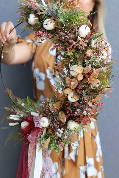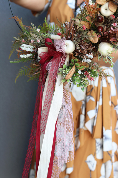 Uroczy wianek w kolorach jesiennego lasu, na metalowej obręczy utkano subtelną z opadłych listków, eterycznej paproci, błyszczących żołędzi, mchu i jagodzin. Dekoracja uzupełniona delikatną, koronkową wstążką. Niewątpliwą ozdobą są maleńkie jabłuszka w białym kolorze.