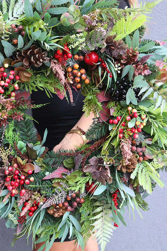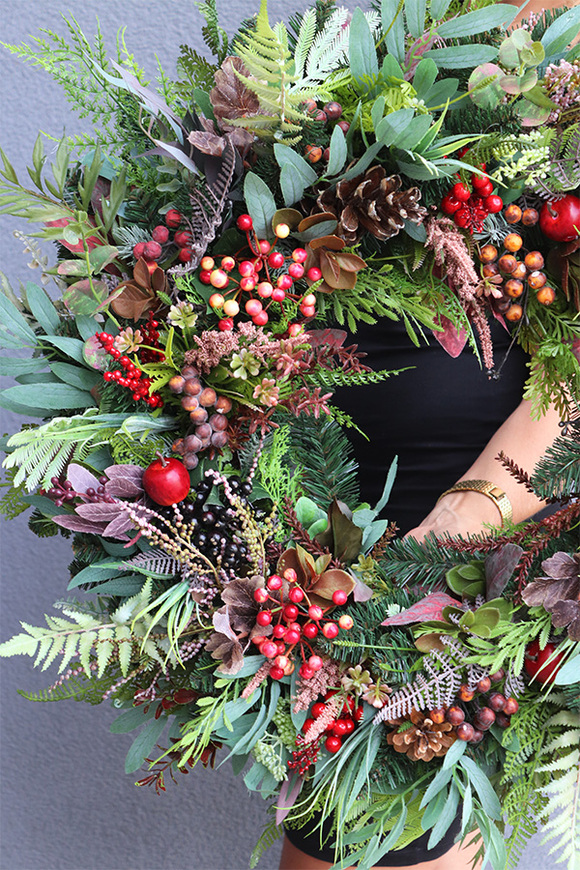 Gustowny wianek w zgaszonych zieleniach i przyćmionych burgundach, ozdobiony szyszkami i kiściami korali leśnych, oddający klimat jesiennego poranka w lesie.