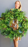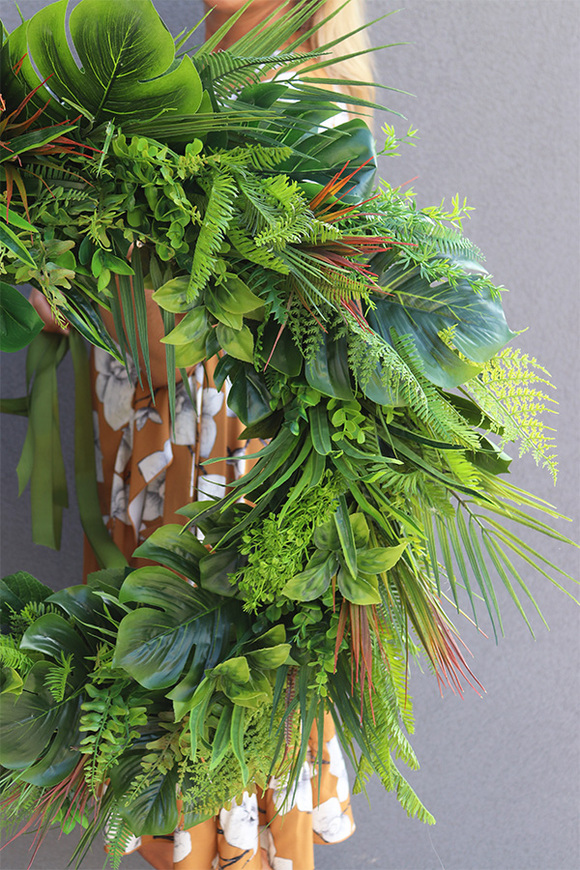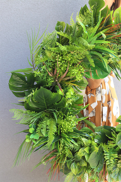 Wyjątkowy, duży wianek w tropikalnym klimacie i barwach nasyconej zieleni. Charakteryzuje go różnorodność roślin zielonych i egzotycznych liści.