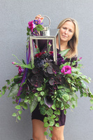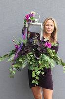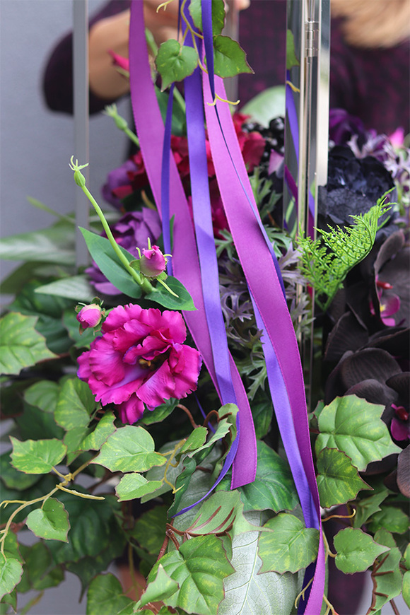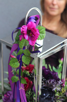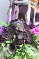 Zachwycająca kompozycja z kwiatów orchideii i eustomy w tonacji ciemnego bakłażanta i amarantu, wśród zgaszonej zieleni liści bluszczu. Subtelnym dodatkiem jest kolorystycznie dobrana wstążka. Całość pięknie wkomponowana w duży, srebrny lampion z uchwytem. Kompozycja tworzy wyjątkową aranżację wyróżniającą sie na każdym pomniku.