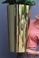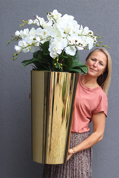 Bardzo duży biały storczyk Golderia New w okazałej, złotej donicy, pasującej zarówno do wnętrz nowoczesnych, jak i tych klasycznych.
