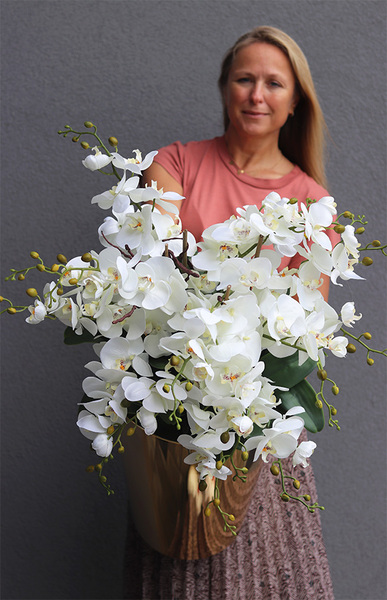 Storczyk w tej kompozycji charakteryzuje się mięsistymi, białymi kwiatostanami, a na ich szczycie pojawia się od kilku do kilkunastu kwiatów i pąków różnej wielkości.