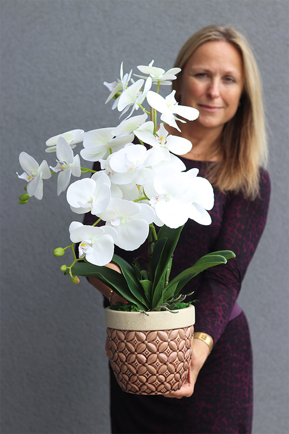Storczyk w tej kompozycji charakteryzuje się mięsistymi, śnieżnobiałymi kwiatostanami z gumowanej tkaniny, a na ich szczycie pojawia się od kilku do kilkunastu kwiatów i pąków różnej wielkości.