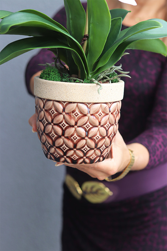 Okazały biały storczyk w orientalnej, cynamonowej donicy z ceramiki, z której wyrastają misternie zamocowane grube, gumowe, świetnie naśladujące żywe liście orchidei. Donica wykończona jest zielonym mchem, który swym urokiem ozdabia całość.