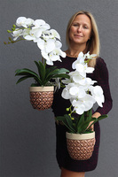 Piękna dekoracja pasująca zarówno do wnętrz nowoczesnych, jak i klasycznych. Efektowne storczyki Bedytana w ceramicznych osłonkach. Okazałe białe storczyki w orientalnej, cynamonowej donicy, z której wyrastają misternie zamocowane grube, gumowe, świetnie naśladujące imitujące żywe liście orchiei. Donica wykończona jest zielonym mchem, który swym urokiem ozdabia całość. Piękna dekoracja pasująca zarówno do wnętrz nowoczesnych, jak i klasycznych. Wysokość całkowita: 48 cm Mili, każdy z naszych wiecznych storczyków możemy wykonać w dowolnej kolorystyce kwiatostanów. Jeśli życzycie sobie zmiany koloru kwiatów, wpiszcie tę uwagę jako informację do zamówienia. Dziękujemy.