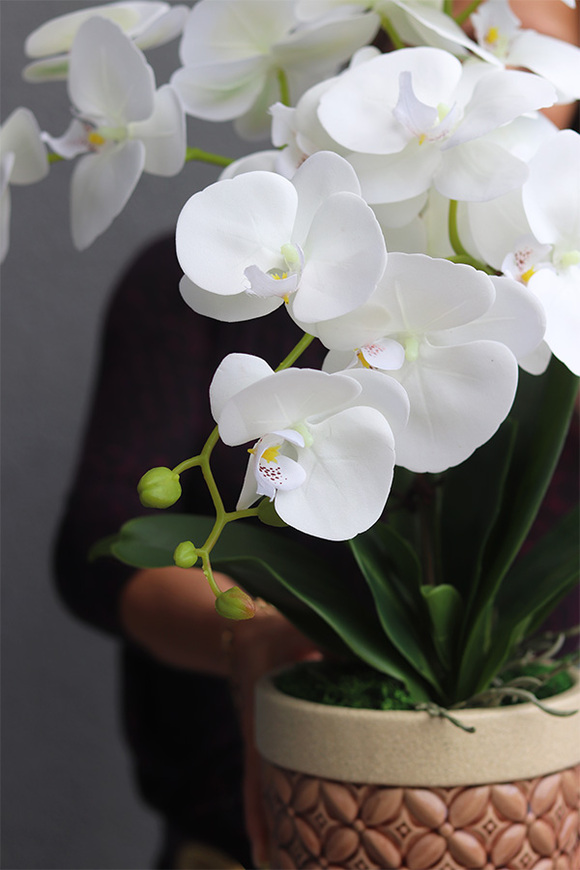 Okazałe białe storczyki w orientalnej, cynamonowej donicy, z której wyrastają misternie zamocowane grube, gumowe, świetnie naśladujące imitujące żywe liście orchiei. Donica wykończona jest zielonym mchem, który swym urokiem ozdabia całość.