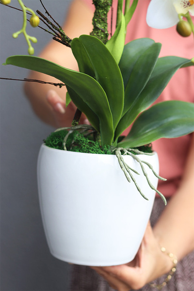 Storczyk wygląda niezwykle realistycznie. Poprzez wyselekcjonowane kwiaty gustownie skomponowane w pieknej donicy z powodzeniem zastępują naturalną roślinę.