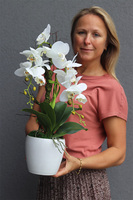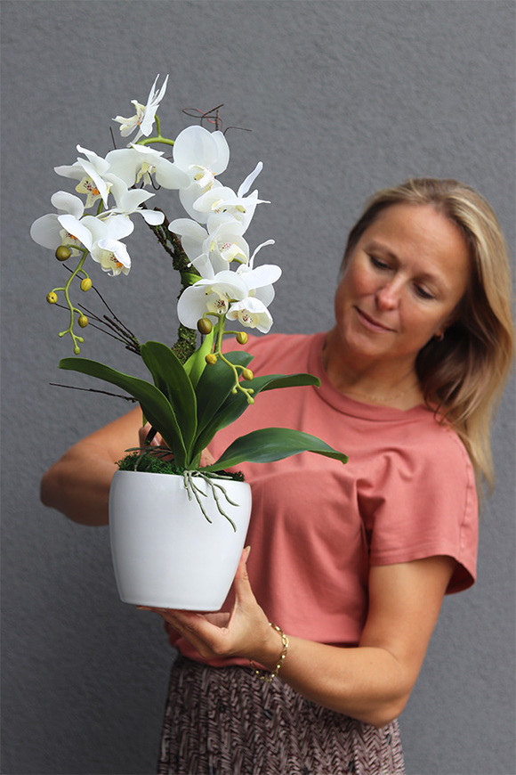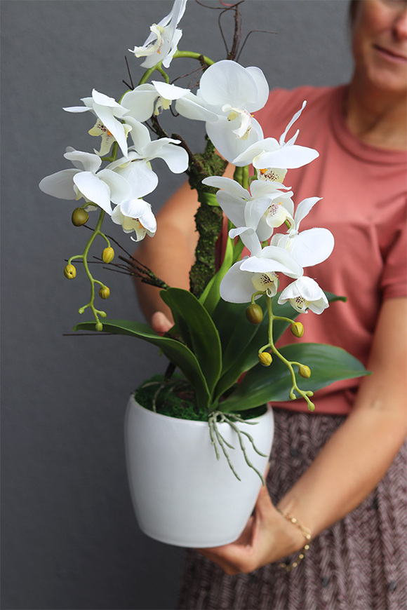 Storczyk w tej kompozycji charakteryzuje się mięsistymi, białymi kwiatostanami, a na ich szczycie pojawia się od kilku do kilkunastu kwiatów i pąków różnej wielkości.