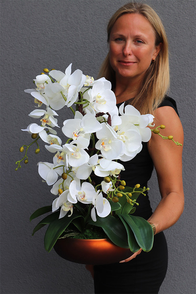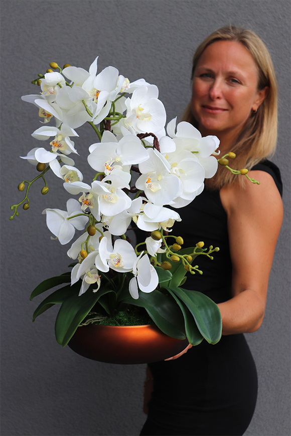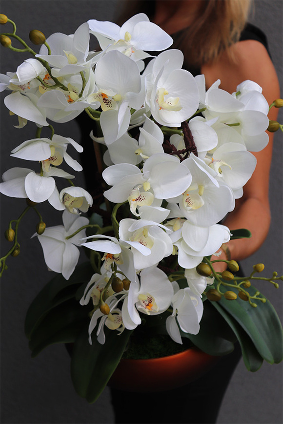 Storczyk w tej kompozycji charakteryzuje się mięsistymi, białymi kwiatostanami, a na ich szczycie pojawia się od kilku do kilkunastu kwiatów i pąków różnej wielkości.