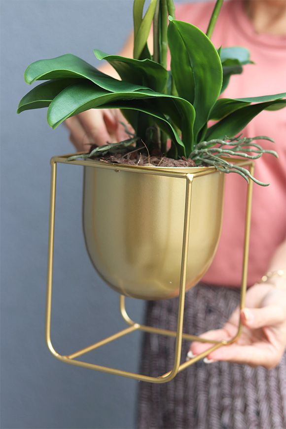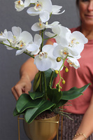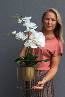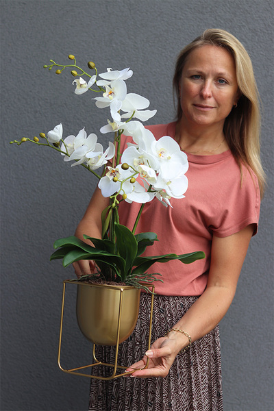 Subtelny biały storczyk Goldista w złotej donicy na stelażu, pasującej zarówno do wnętrz nowoczesnych, jak i tych klasycznych.
