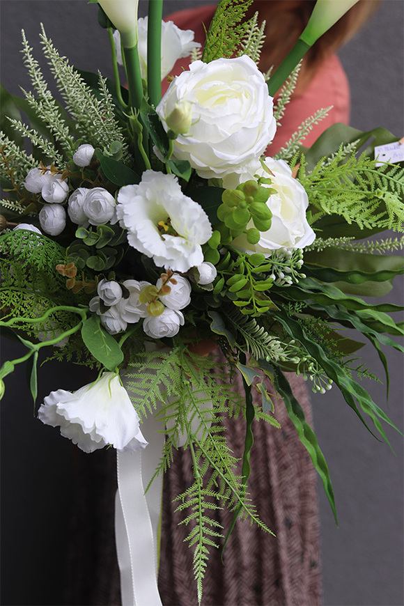 Uroczy, subtelny bukiet z dorodnych, białych róż, kalii, pełników, kwiatów wrzośca oraz zielonych, wyrazistych liści filodendrona. Delikatnym uzupełnieniem jest biała wstążka. Kompozycja ułożona ze sztucznych, wysokiej jakości roślin, doskonale imitujących żywe.