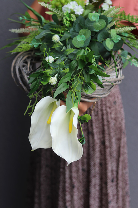 Uroczy, subtelny bukiet z dorodnych, białych róż, kalii, pełników, kwiatów wrzośca oraz zielonych, wyrazistych liści filodendrona. Delikatnym uzupełnieniem jest biała wstążka. Kompozycja ułożona ze sztucznych, wysokiej jakości roślin, doskonale imitujących żywe.