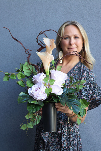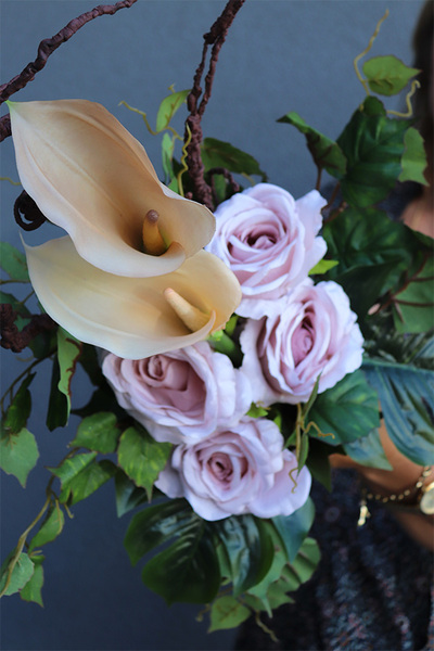 Zachwycający bukiet nagrobny we wkładzie do wazonu, ułożony z bladofioletowych róż na bazie zielonych listków bluszczu i filodendrona, z pięknymi beżowymi kallami i egzotycznym korzeniem. Kompozycja tworzy aranżację wyróżniającą się na każdym pomniku.