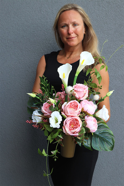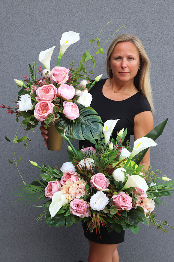 Bukiet Pink Resiano tworzą dorodne róże, kwiaty kalii, eustomy i hortensji. Lekkości dodają jej zielone osty iliscie palmy. Dekoracja jest bardzo bogata i efektowna, gustownie skomponowana, całość podtrzymują błyszczące liście filodendrona.