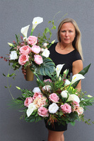 Bukiet Pink Resiano tworzą dorodne róże, kwiaty kalii, eustomy i hortensji. Lekkości dodają jej zielone osty iliscie palmy. Dekoracja jest bardzo bogata i efektowna, gustownie skomponowana, całość podtrz...