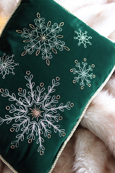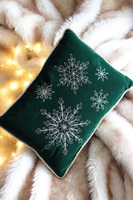 Piękna, welurowa poduszka zdobiona świątecznym motywem śnieżynek.