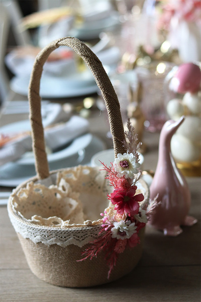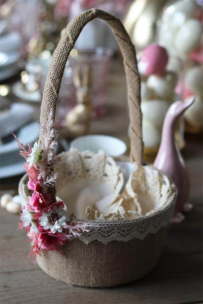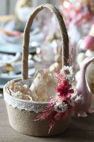 Sam koszyczek jest w owinięty tkaniną, z zewnątrz trwałą jutą, wewnątrz - praktyczną folią. Dodatkowego uroku przydaje mu szeroki pas koronki na rancie.
