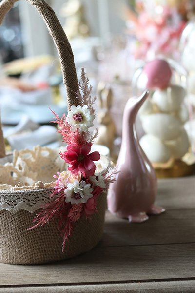 Koszyczek wielkanocny Alicante, przyozdobiony kompozycją z delikatnych kwiatów w różowo-kremowej kolorystyce, osadzonych wśród gałązek sztucznego suszu.