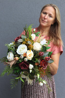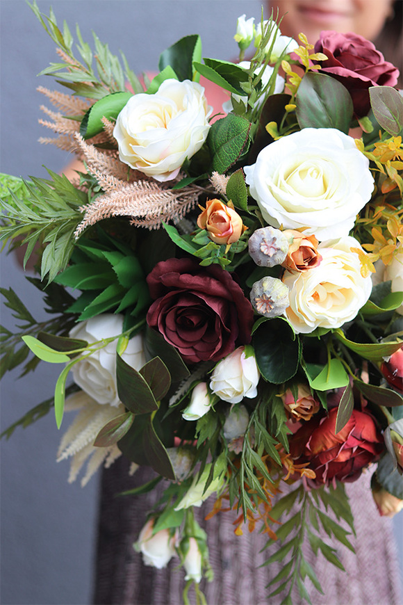 Kompozycję Japosti tworzą dorodne róże, eustoma, trawy i owocostany maku. Lekkości dodają jej zielone, delikatne liście. Dekoracja jest bardzo bogata i efektowna, gustownie skomponowana.