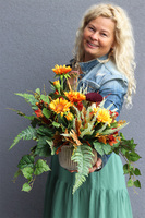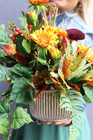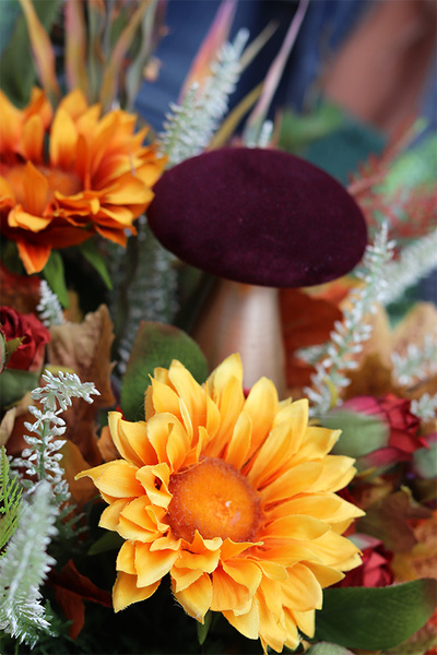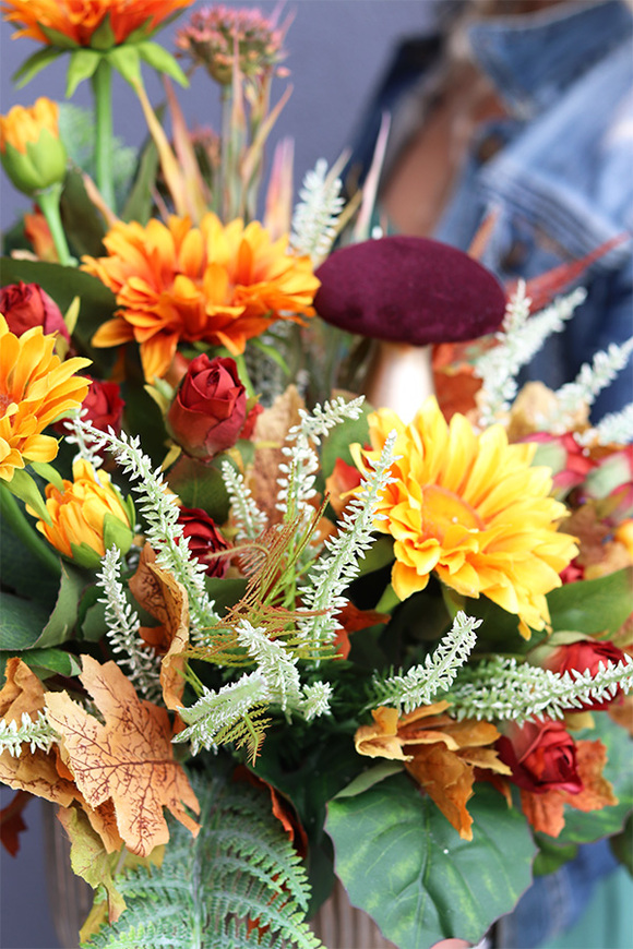 Zachwycająca kompozycja z kwiatów w tonacji oranżu, żółci i zieleni. Dekoracja, która doda blasku pięknej, złotej jesieni każdemu miejscu. Gustownie dobrane kwiaty gerbery, biały wrzos, liście bluszczu i paproci, kolorowe korale tworzą ciepłą, jesienną aranżację. Okazały, aksamitny kapelusz grzyba dodaje uroku całości. Kompozycja osadzona w pięknym, złotym naczyniu o fantazyjnej fakturze.