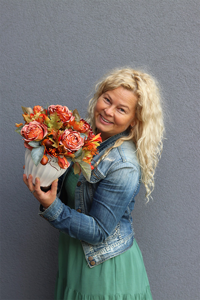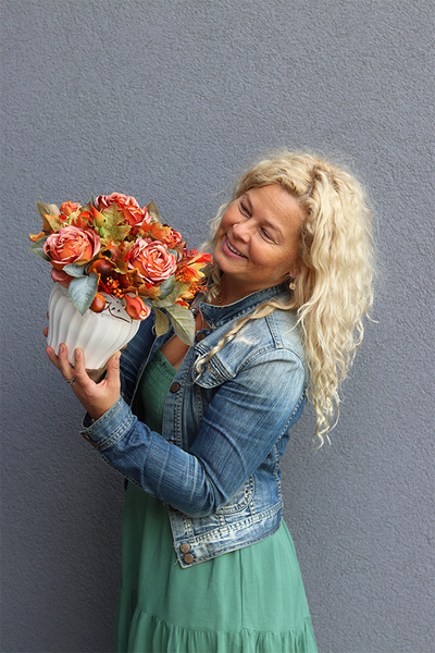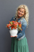 Zachwycająca kompozycja z kwiatów róż w tonacji oranżu o wielu odcieniach, przetykanych subtelnie pięknymi liśćmi. Całość osadzona w romantycznej, białej donicy o frezowanej powierzchni i koronkowej lamówce. Jesienny klimat kompozycji podkreślaja barwne liście dębu.