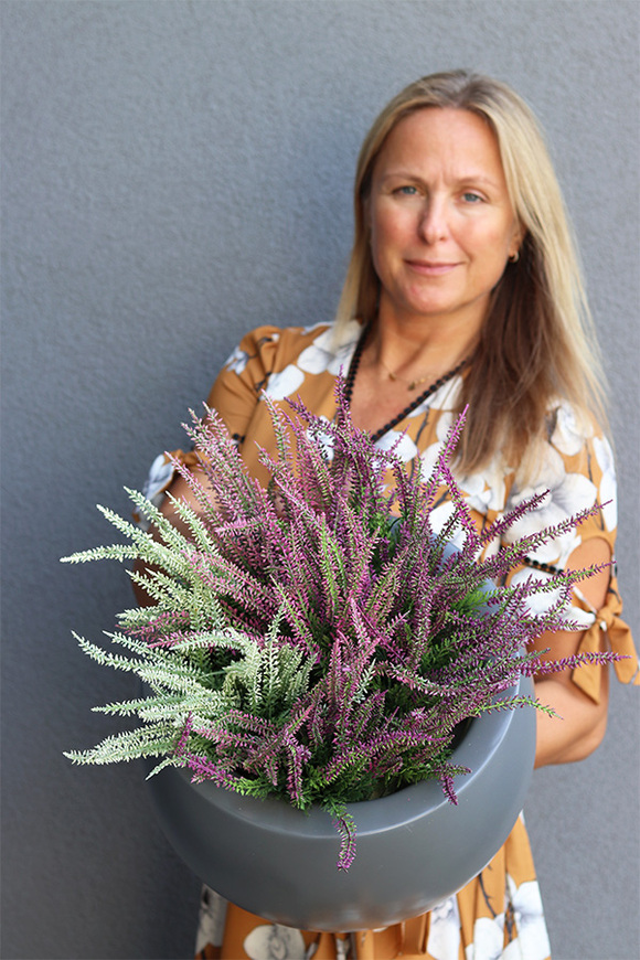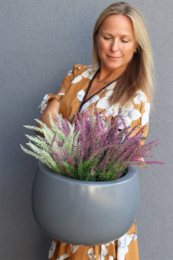 Duża, donica fiberglass, w kolorze delikatnej szarości, wypełnione leśnymi, kwitnącymi wrzosami. Urocza kompozycja, doskonale imitująca naturalne rośliny, ozdobi jesiennie osłonięty taras, holl czy salon.