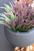 Duża, donica fiberglass, w kolorze delikatnej szarości, wypełnione leśnymi, kwitnącymi wrzosami. Urocza kompozycja, doskonale imitująca naturalne rośliny, ozdobi jesiennie osłonięty taras, holl czy salon.