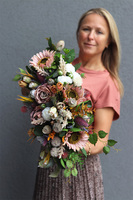 Kompozycję Ledisto tworzą dorodne róże, słoneczniki, osty i owocostany maku. Lekkości dodają jej zielone, delikatne liście. Dekoracja jest bardzo bogata i efektowna, gustownie skomponowana.