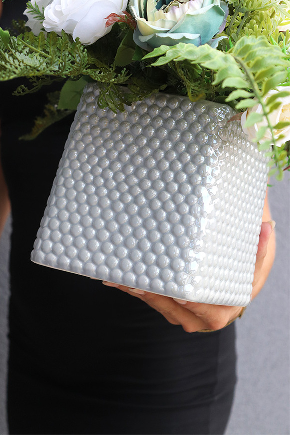 Blue Milenia to elegancka kompozycja pełna wyszukanych, wysokiej jakości sztucznych kwiatów w barwach błękitu i kremowej bieli w pięknej ceramicznej, białej misie o geometrycznym kształcie.