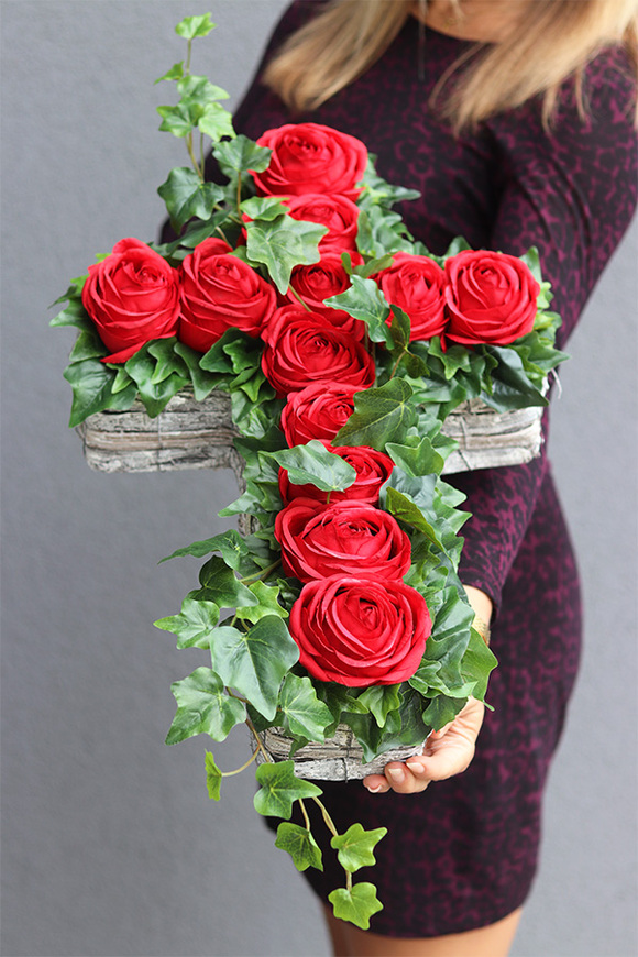 Elegancka kompozycja nagrobna ze starannie dobranych, wysokiej jakości sztucznych czerwonych róż, stabilnie ułożonych we wkładzie florystycznym w kształcie krzyża.