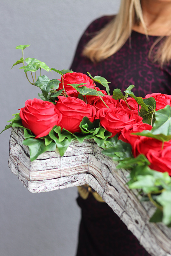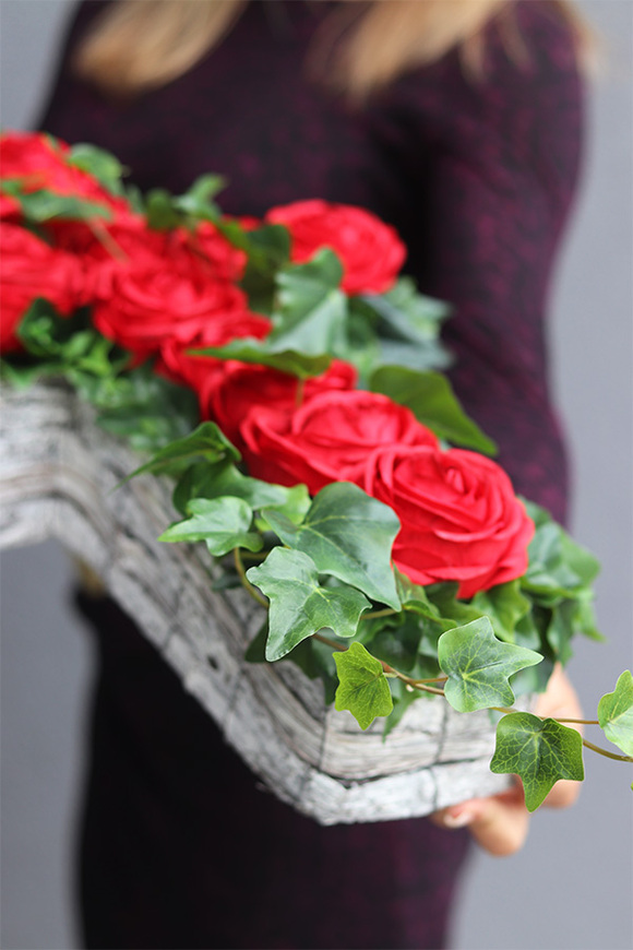 Christi Roses to wyjątkowa i szlachetna dekoracja nagrobna w wytrawnych, stonowanych barwach. W kompozycji dominuje czerwień kwiatów na tle ciemnej zieleni gałązek bluszczu.