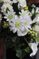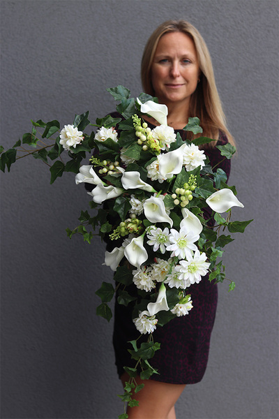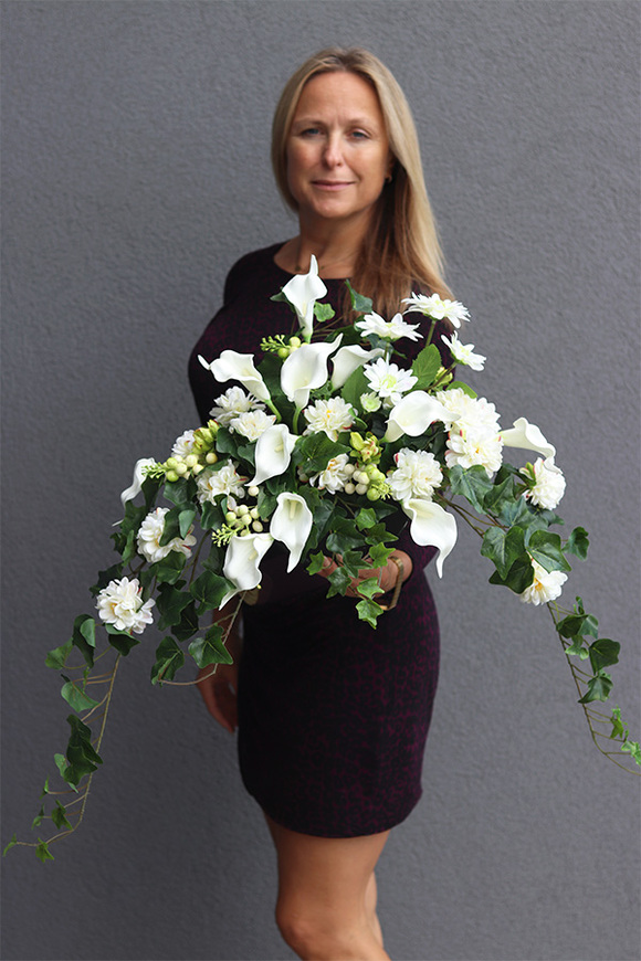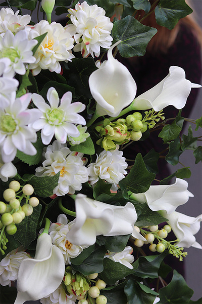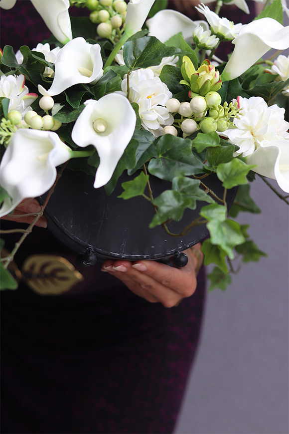 Kallisa Biel to elegancka, wyjątkowo subtelna kompozycja pełna wyszukanych, wysokiej jakości sztucznych kwiatów w białej tonacji. Dekoracja ułożona artystycznie w oryginalnym, metalowym, czarnym naczyniu na kulistych nóżkach. Kompozycja wyróżnia się szczególnym doborem delikatnych kwiatów - kalli, margerytek, białych kulistych owoców krzewów. Całość wkomponowana w naturalną zieleń bluszczu, którego zwisające pędy czynią Kallisę Biel niezwykle romantyczną.