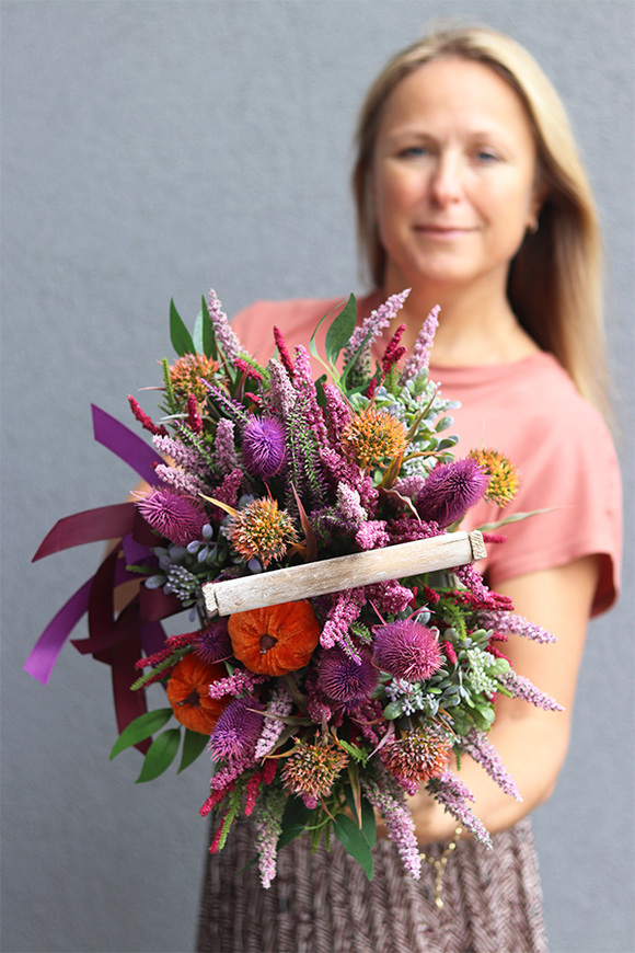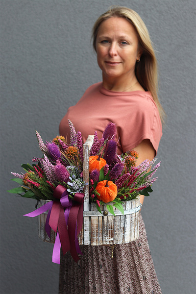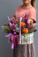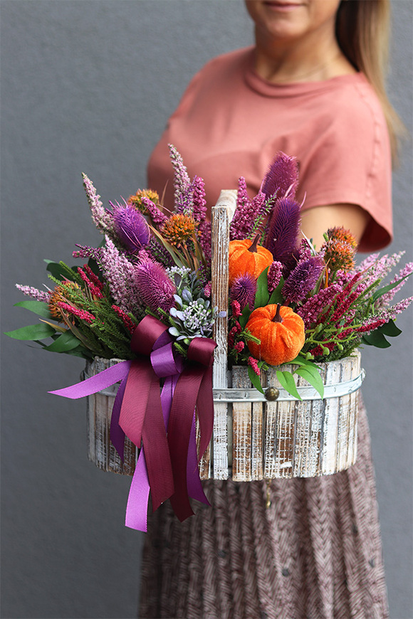 Koszyczek Dyniowy to piękna kompozycja wypełniona wysokiej jakości sztucznymi gałązkami wrzosów, ostów i pięknych, welurowych dyń.