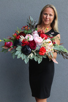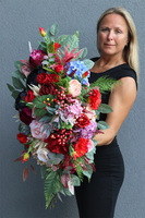 Kompozycję Laos Englano tworzą dorodne róże, bakłażanowe peonie, kwiaty hortensji, eustoma i czerwone korale leśnych krzewów. Lekkości dodają jej czerwono wybarwione liście ruskusa i zielone pióopusze paproci. Dekoracja jest bardzo bogata ...