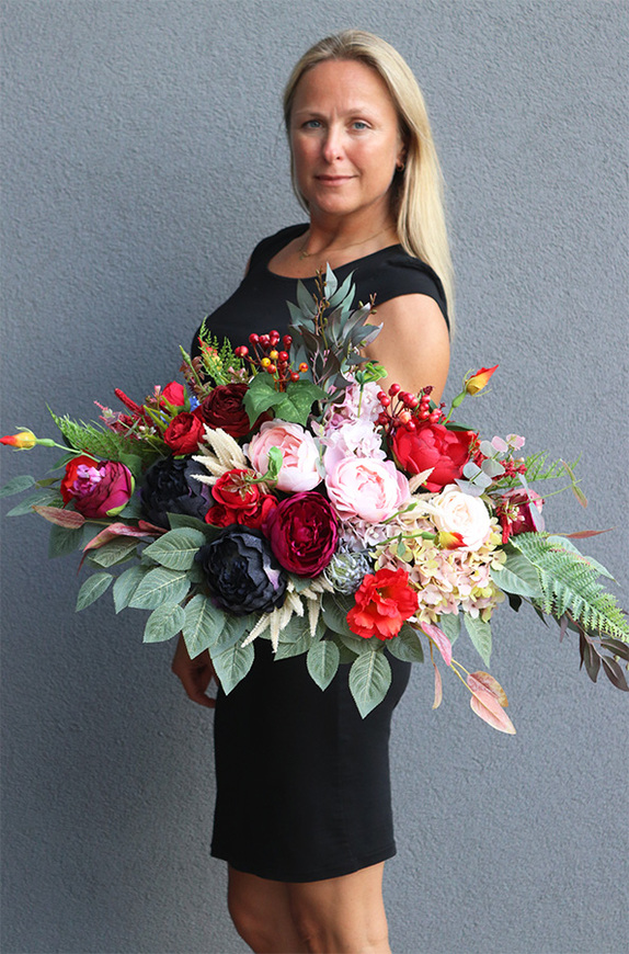 Kompozycję Laos Englano tworzą dorodne róże, bakłażanowe peonie, kwiaty hortensji, eustoma i czerwone korale leśnych krzewów. Lekkości dodają jej czerwono wybarwione liście ruskusa i zielone pióopusze paproci. Dekoracja jest bardzo bogata i efektowna, gustownie skomponowana.