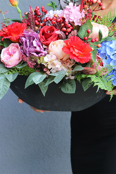 Laos Englano to elegancka, barwna kompozycja pełna wyszukanych, wysokiej jakości sztucznych kwiatów w pięknej, czarnej donicy.