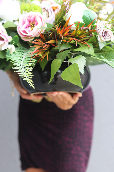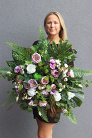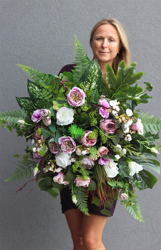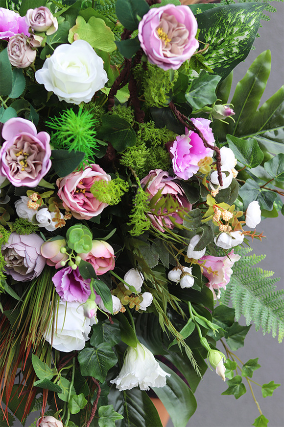 Memona to elegancka dekoracja nagrobna, pełna wyszukanych, wysokiej jakości sztucznych kwiatów w odcieniach zgaszonego fioletu i bieli w pięknej ceramicznej, czarnej donicy. Lekkości dodaja jej zielone mchy, paprocie i łodygi leśnych traw.