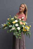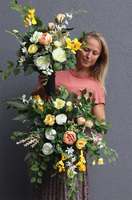 Kompozycję Złota Dolina tworzą dorodne róże, frezje, pełniki i ostróżki. Lekkości dodają jej zielone pędy bluszczu. Dekoracja jest bardzo bogata i efektowna, gustownie skomponowana.