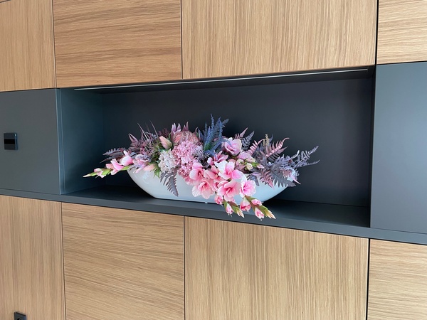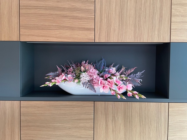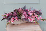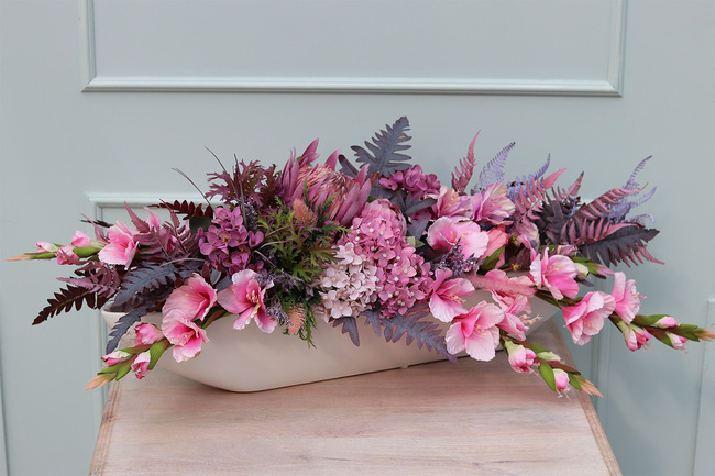 Dekoracja Wrzosy Moko Pink w pięknej, podłużnej białej donicy, ułożona z okazałych, różowych kłosów gladiolusa, kwiatów jesiennej hortensji, bakłażanowych paproci i karczocha tworzy niezwykłą, niemalże egzotyczną, ozdobę w eleganckim stylu.