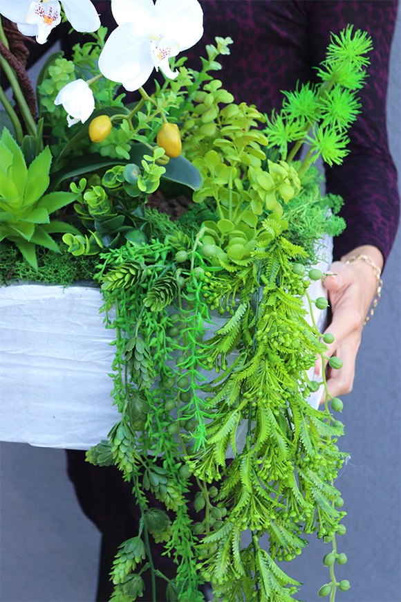 Z donicy, wyrastają misternie zamocowane grube, imitujące naturalne liście. Donica wykończona jest mchem, który swym urokiem ozdabia całość.