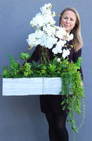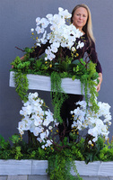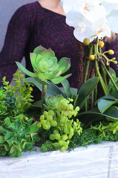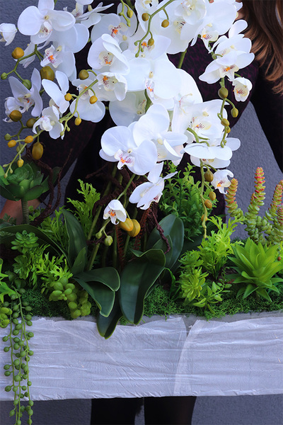 Okazała dekoracja z białych storczyków, osadzonch wśród soczystej zieleni egzotycznych sukulentów. Całość przygotowana do umieszczenia w podłużnej donicy.