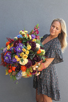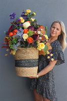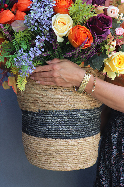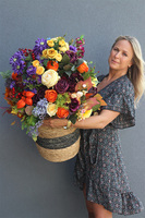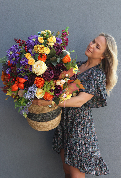 Piękny kosz wypełniony bogatą kompozycją kwiatową w jesiennej tonacji. Pełno tutaj intensywnych barw - żółtego, fioletu i pomarańczy - które pięknie kontrastują ze sobą i neutralnym koszem w jakim zostały obsadzone.