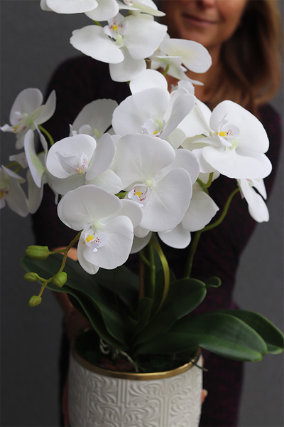 Okazałe, białe storczyki z gumowanej tkaniny, ułożone w eleganckiej, ceramicznej donicy ze złotą, z której wyrastają misternie zamocowane grube, imitujące naturalne liście rośliny. Donica wykończona jest zielonym mchem, który swym urokiem ozdabia całość.