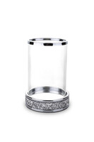 Piękny, szklany świecznik, lampion ze srebrnymi zdobieniami na podstawie. Elegancki dodatek do salonu, jadalni, na parapet. Wyjątkowa świąteczna dekoracja.