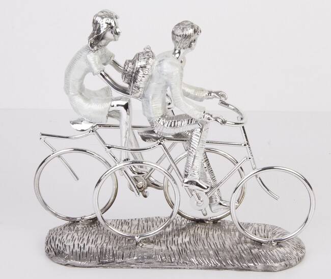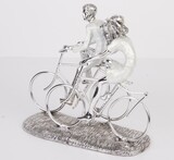 Elegancka srebrna figurka z wysokiej jakości tworzywa, przedstawiająca romantyczną parę kolarzy.