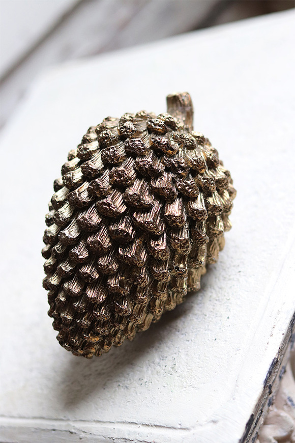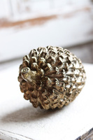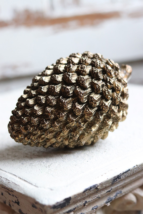 Urocza, imitująca naturalną szyszkę dekoracja świąteczna. Piękna ozdoba do stroików, lub jako dekoracja na stół, komodę, parapet. Szyszka w kolorze starego złota.