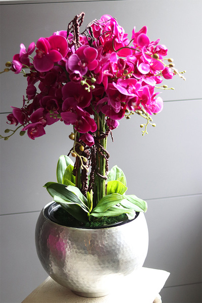 Storczyki, które zostały użyte do wykonania pięknej dekoracji mają mięsiste kwiatostany w kolorze fuksji, wykonane z usztywnianej tkaniny. Na ich szczycie pojawia się od kilku do kilkunastu kwiatów i pąków różnej ...