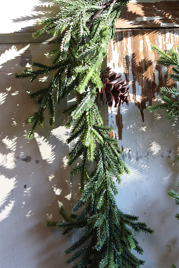 Dekoracyjna girlanda z iglastych zielonych gałązek, pokrytych delikatnym borkatem, przypomninającym szron. Między łodygami wplecione są drobne szyszki.